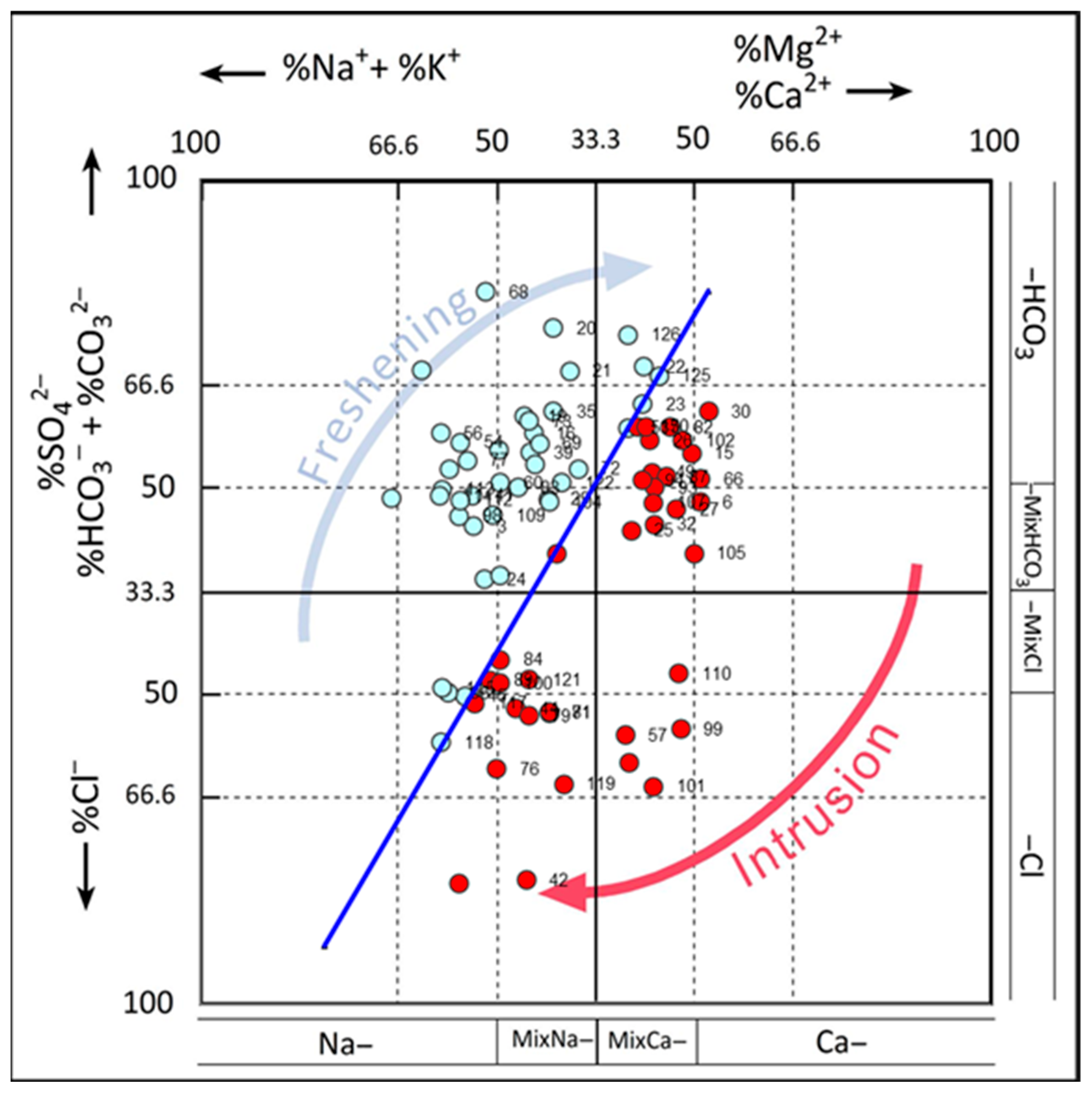- Piper, A.M. A graphic procedure in the geochemical interpretation of water-analyses. EOS Trans. Am. Geophys. Union 1944, 25, 914–928. [Google Scholar]