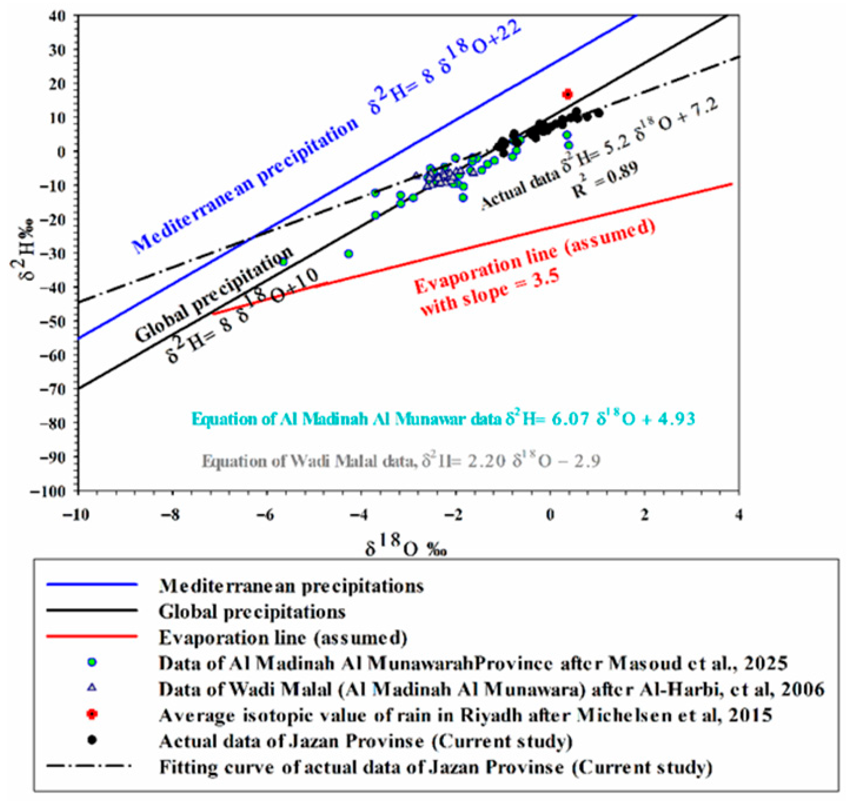 - Masoud, M.; El Osta, M.; Al-Amri, N.; Niyazi, B.; Alqarawy, A.; Halawani, R.; Rashed, M. Groundwater Recharge Evaluation Using Stable Isotopes and the NETPATH Model in Al-Madinah Al-Munawarah Province, Saudi Arabia. Water 2025, 17, 211. [Google Scholar] [CrossRef]