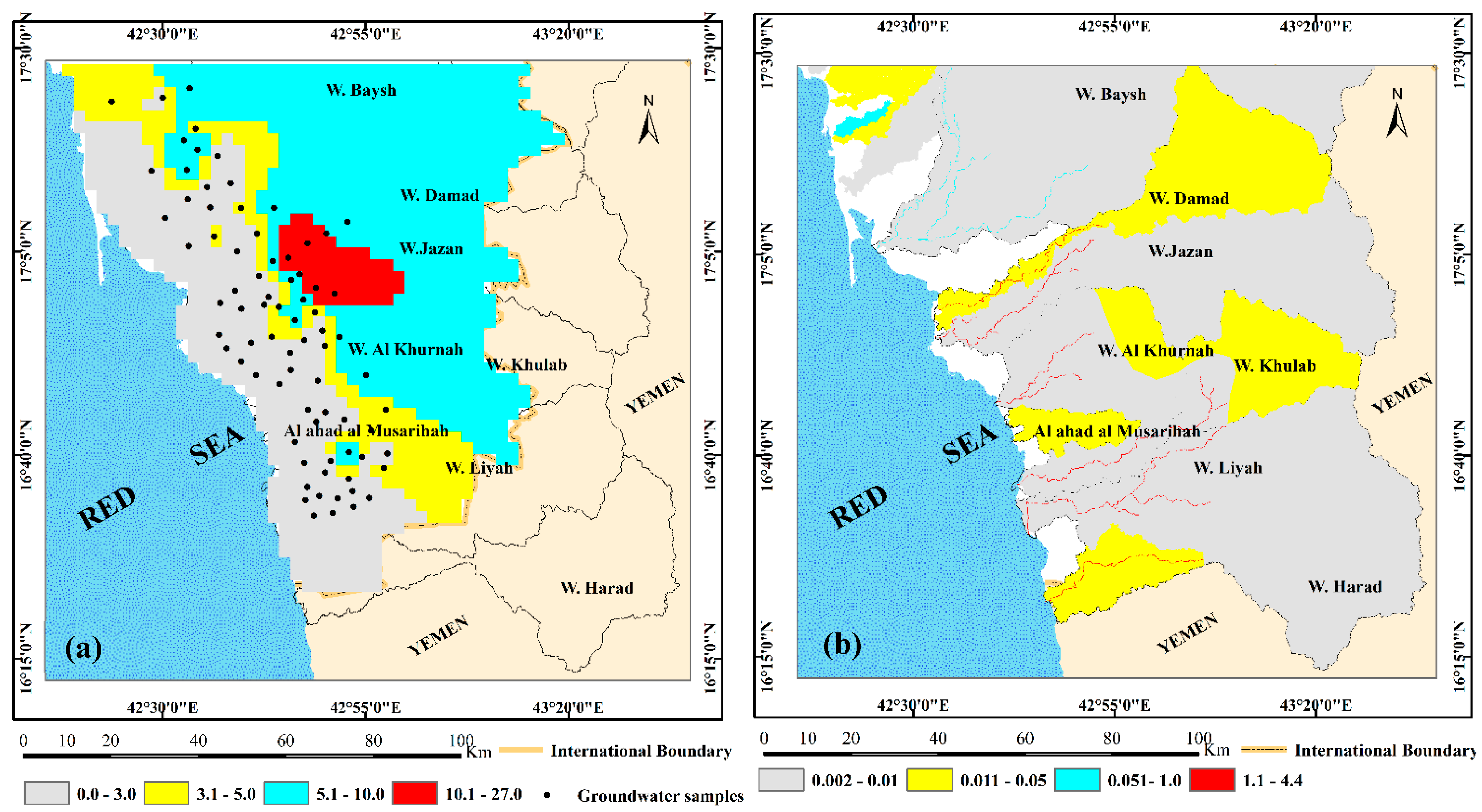 - Abdalla, F.; Al-Turki, A.; Al Amri, A. Evaluation of groundwater resources in the Southern Tihama plain, Saudi Arabia. Arab. J. Geosci. 2015, 8, 3299–3310. [Google Scholar] [CrossRef]