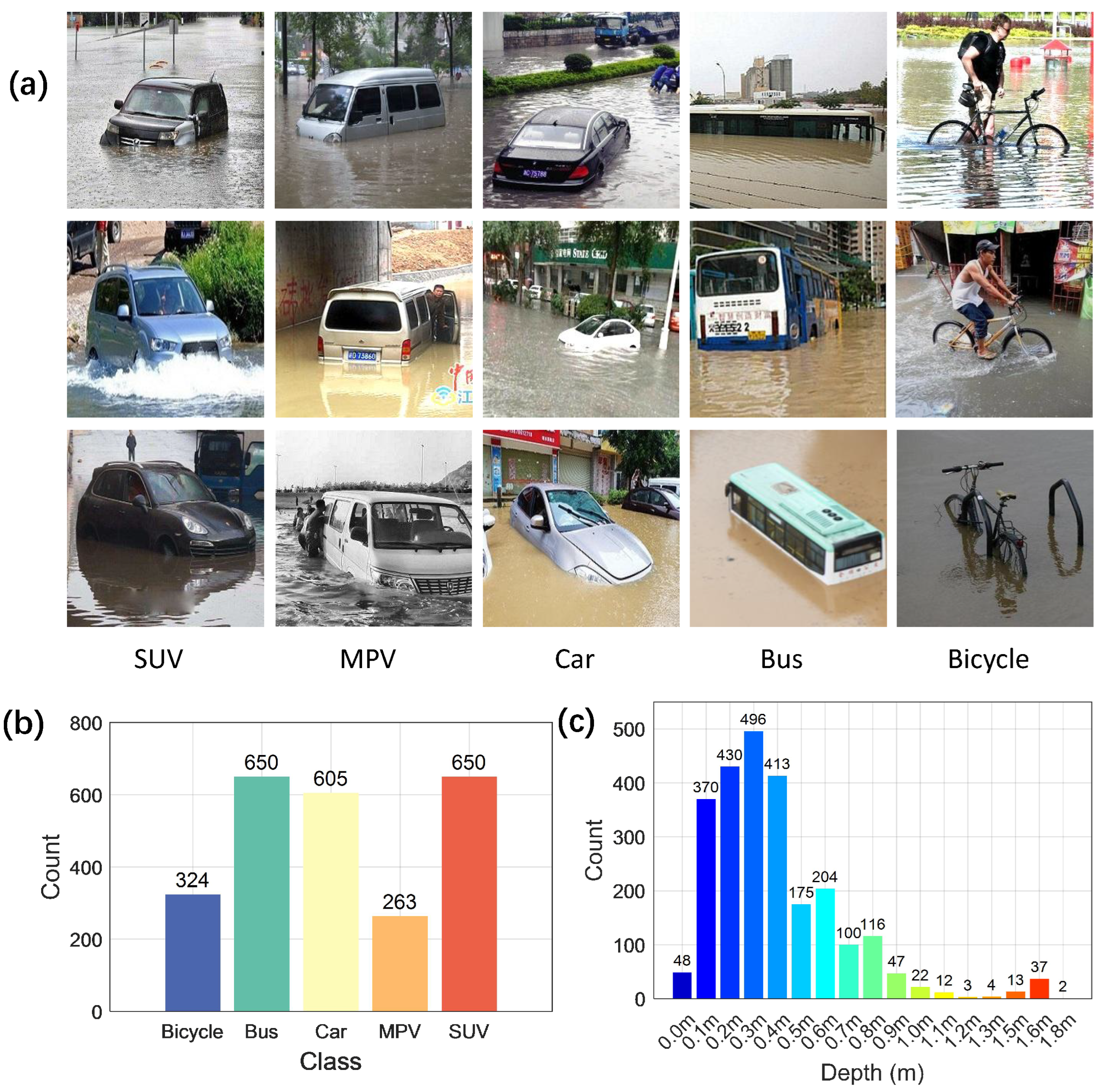 Effective reference objects should meet three key criteria: (1) They should be common in flood scenes to ensure easy identification and widespread availability. Pedestrians, vehicles, and road signs are frequently observed in urban flood scenes, making them practical choices that enhance the model’s adaptability to diverse environments. (2) Reference objects should have stable and well-defined heights to serve as reliable benchmarks. For instance, adult heights typically range between 1.5 to 1.9 m, while vehicles of the same type follow standardized dimensions. Municipal fixtures like road/traffic signs also maintain fixed heights. (3) The visual characteristics of reference objects should vary noticeably at different water depths to support accurate waterline detection. Vehicles and pedestrians, for example, exhibit clear morphological changes as water levels rise, providing strong visual references for flood depth estimation. In contrast, utility poles, which appear similar over a wide range of heights, are less suitable for this purpose. By following these reference object selection criteria, the subsequent automated data collection can gather massive data that is both widely distributed and rich in water depth information.