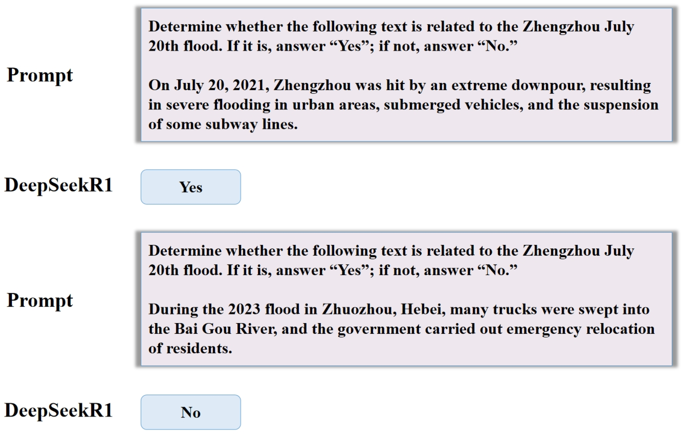 The collected messages often include information that is not associated with the target flood event. So, the large language model DeepSeek-R1 is employed to assess the text content and determine whether it pertains to a specific flood event. If the model concludes that the text is unrelated to the target flood event, the message is discarded. This filtering process effectively isolates high-quality data relevant to the focus event. To achieve precise and efficient large model filtering, this paper designs the DeepSeek-R1 prompt template. This template specifies core considerations for the large model and constrains its output to concise binary responses (Yes/No), thereby enhancing decision-making efficiency. For instance, in the case of the Zhengzhou 7·20 Flood Event, the prompt template used for this filtering process is shown in