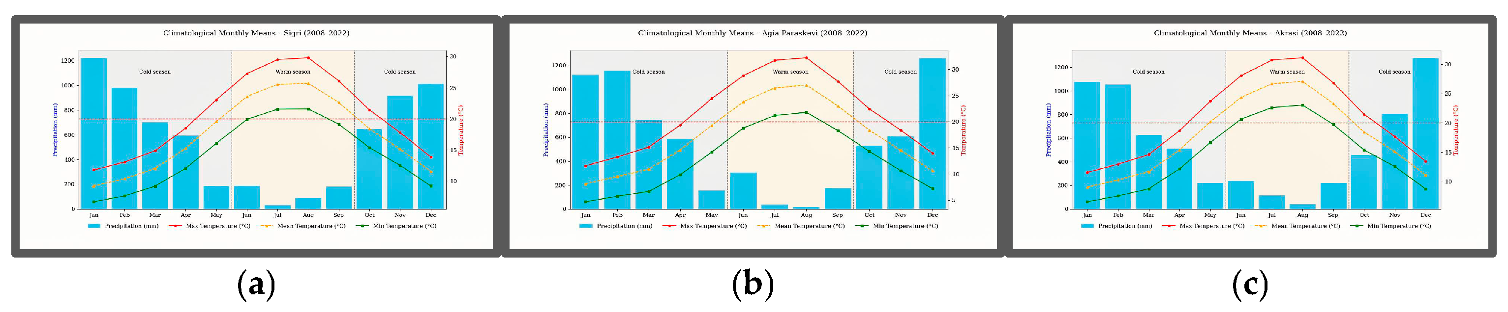 - Zerefos, C.; Xoplaki, E.; Kapsomenakis, J.; Solomos, S.; Poupkou, A.; Gerasopoulos, E. Past, Present, and Future Climates in the Mediterranean. In Environmental Sustainability in the Mediterranean Region. Springer Geography; Ferreira, C.S.S., Destouni, G., Kalantari, Z., Eds.; Springer: Cham, Switzerland, 2024. [Google Scholar] [CrossRef]