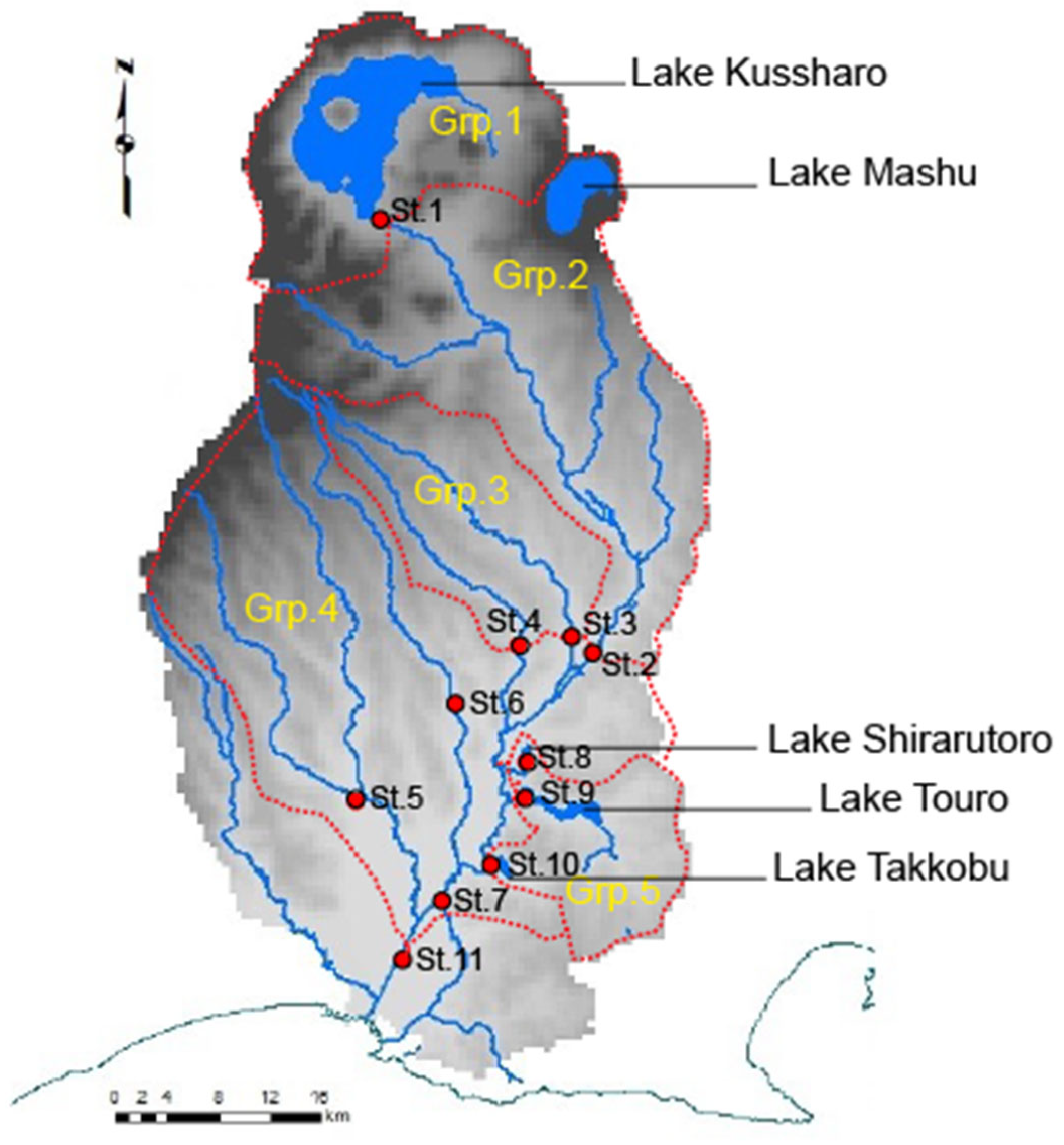 - Komai, K.; Nakayama, K.; Hiroki, S.; Sakaguchi, S. Estimation of dissolved substances transport in Kushiro River basin using dissolved ion pattern. J. Jpn. Soc. Civ. Eng. Ser B1 (Hydraul. Eng.) 2018, 74, 1505–1510. [Google Scholar] [CrossRef]
