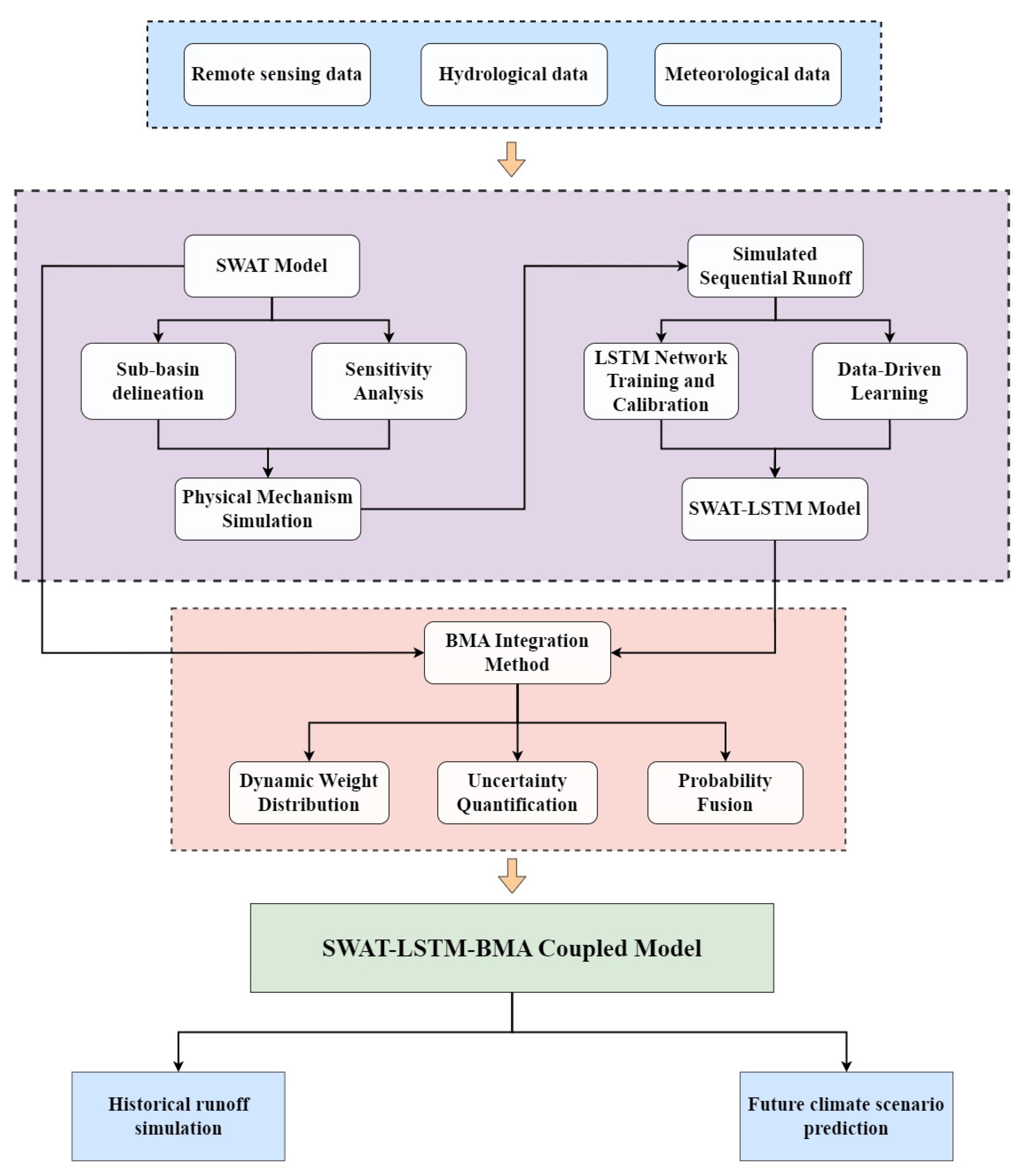 13] constructed a SWAT-LSTM coupling framework in areas with scarce data, which effectively improved the simulation accuracy of watershed runoff, but still pointed out that the framework was not robust enough in dealing with extreme events and failed to quantify the contribution of uncertainty between models. In summary, the coupling of the SWAT model and LSTM model can take into account the benefits of data-driven methods and physical mechanics. However, simple series coupling does not solve the problem that the sources of uncertainty of the two are different and the contribution degree is unknown. Therefore, there is an urgent need for a method that can systematically quantify and integrate the uncertainty of the physical mechanism model and the data-driven model to improve the reliability and interpretability of the prediction results.