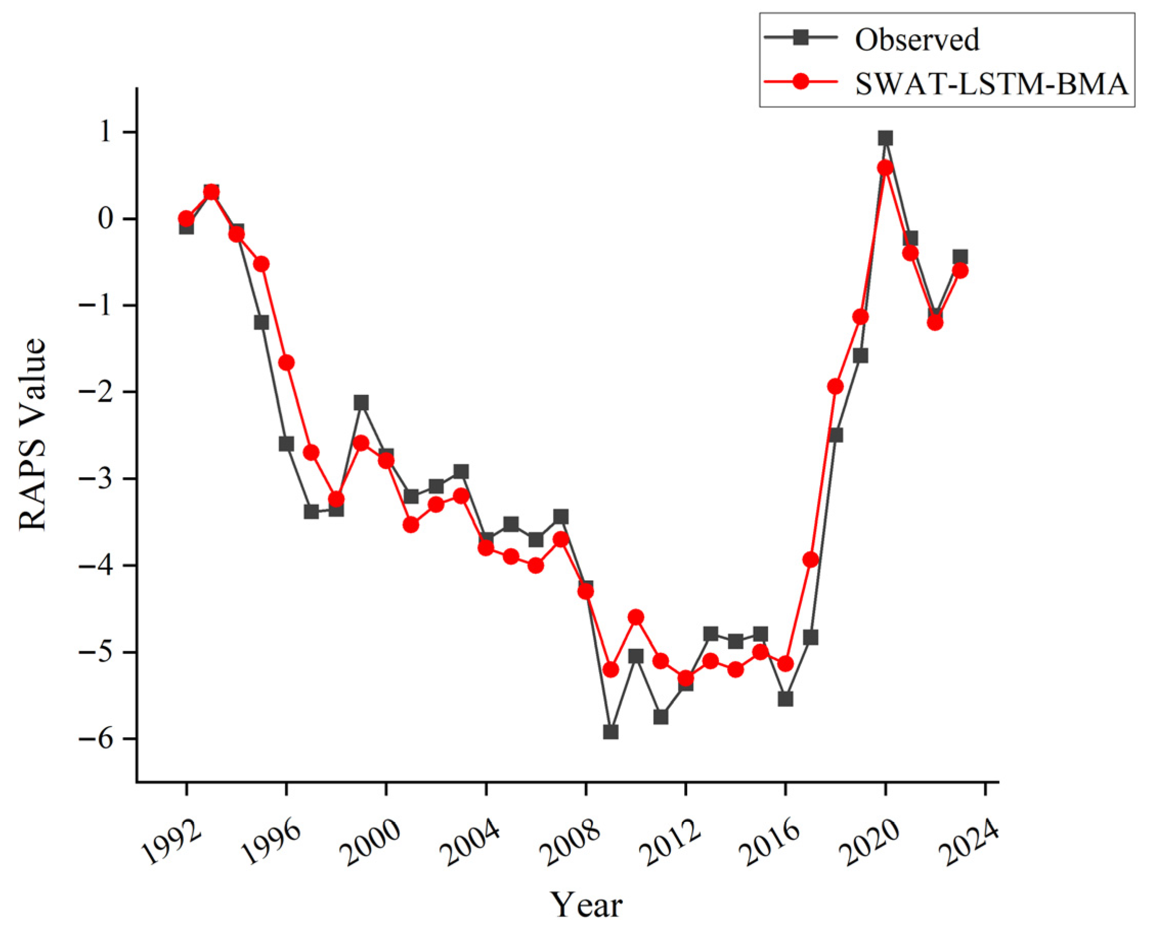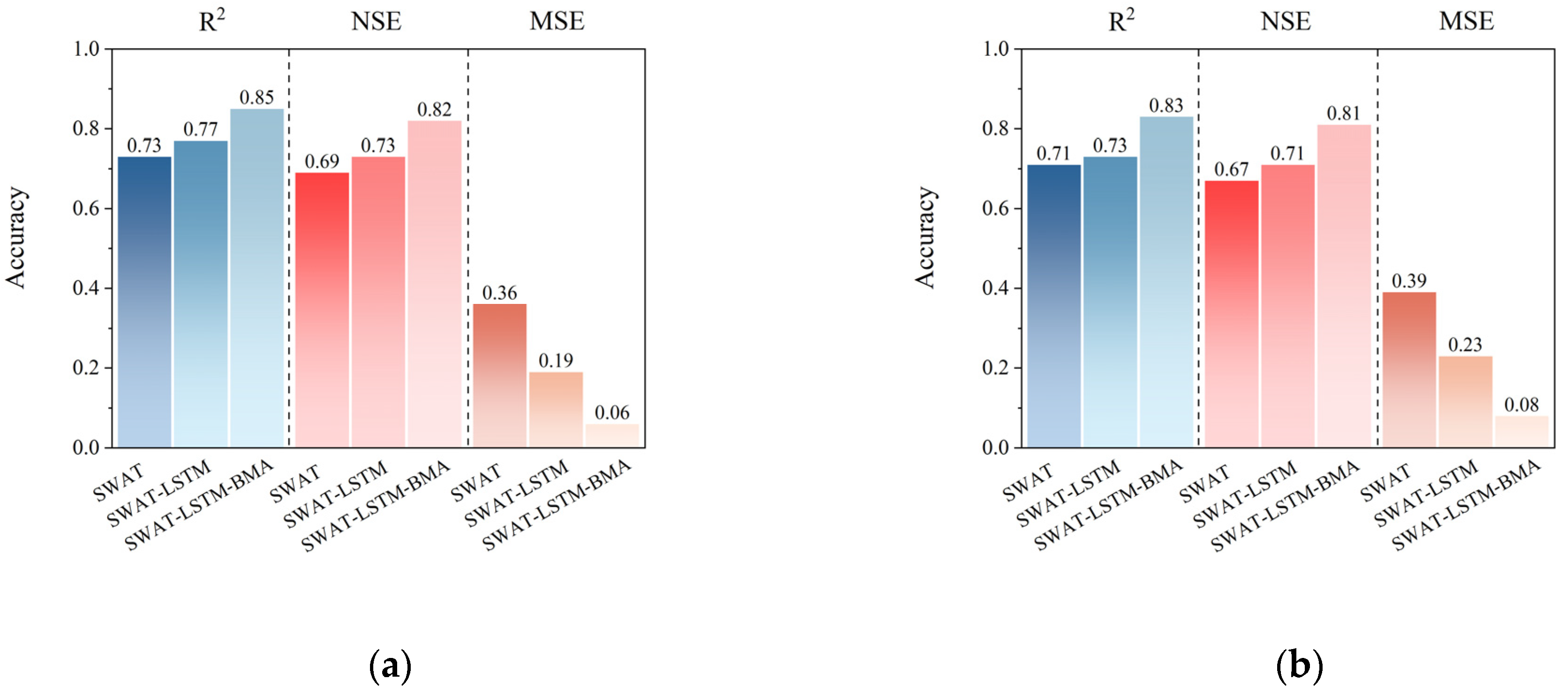 32]. The BMA method used in this study intelligently schedules the advantages of the SWAT model and the SWAT-LSTM model under different hydrological conditions through the dynamic weight allocation mechanism. It tends to rely on the physical robustness of the SWAT model during the dry season and turns to the correction ability of the SWAT-LSTM model during the flood season. Therefore, BMA not only improves the prediction accuracy, but also reveals its unique value beyond the single series framework by realizing the scenario-adaptive model selection, that is, systematically quantifying the structural uncertainty in the hybrid modeling.