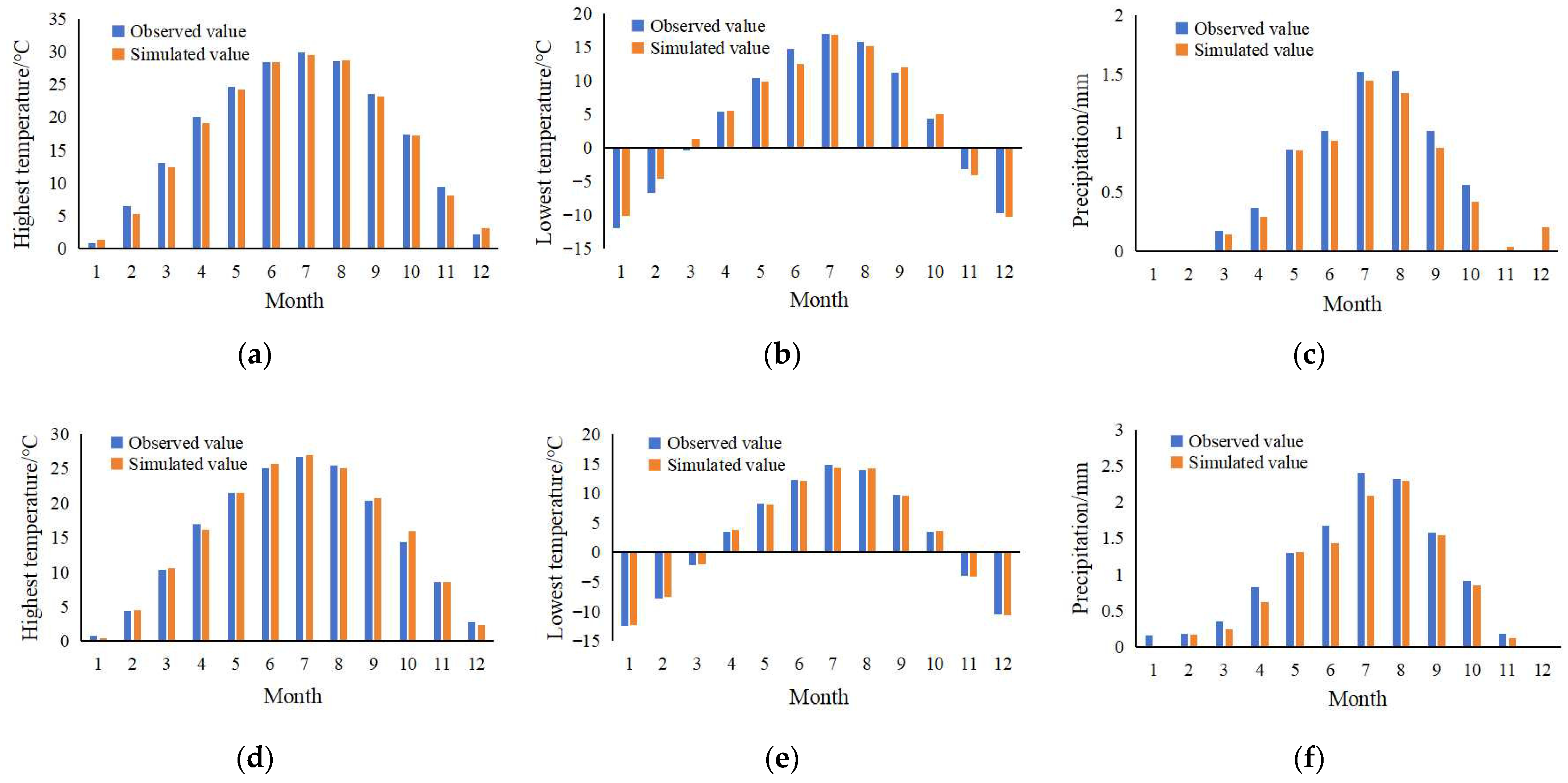 41] used the SDSM model and FDSM to process data from three RCP scenarios of CMIP5. They selected two forecasting factors for temperature and two forecasting factors for precipitation. The results indicate that the SDSM model can effectively handle large-scale climate model data, but it uses fewer forecasting factors and has higher result uncertainty. Therefore, this study uses the SDSM model to process CMIP6 data, selecting 8–10 predictors for temperature and 5–7 predictors for precipitation, achieving overall excellent accuracy.