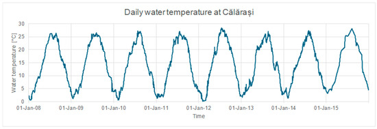 Chiciu–Călărași represents an important gauging station (GS) on the left bank of the Danube River. Measured data consist of daily water temperatures at Călărași GS, where the mean multiannual water temperature is 14.2 °C, with annual variation between 0 and 28 °C [29]. The mean multiannual flow at Chiciu GS (rkm 371) is 6107 m3/s [30].