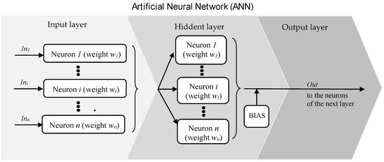 An ANN contains three or more layers: one input layer, at least one intermediate (hidden) layer, and one output layer. In turn, these layers include a number of neurons. The neurons of the input layer are connected to the input parameters, and the neurons from the output layer correspond to the output parameters. The number of hidden layers, and their number of neurons, depend on the ANN model. To each neuron, from any of the layers, a weight is assigned. The value of the weight ranges from 0 to 1, showing the influence the neuron has over the network.