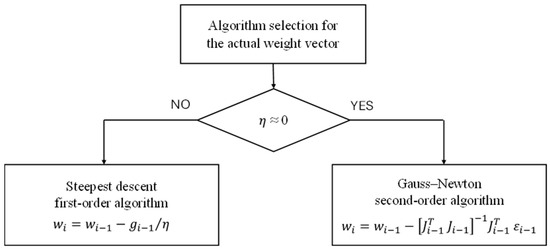 The selection between two algorithms is influenced by the η parameter [41]. The flowchart in Figure 7 summarizes the training selection algorithm of the ANN model. When η tends to zero, the Gauss–Newton second-order algorithm is used, while for larger η values the steepest descent first-order algorithm applies. In Figure 7, is the first-order derivative of the total error vector and 1/η represents the step size (the learning coefficient).