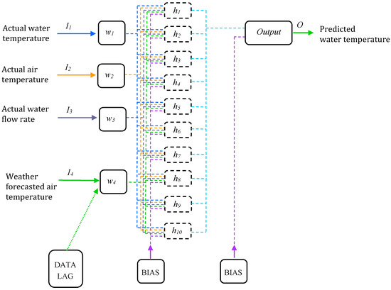 Figure 8 presents the chosen architecture of the ANN forecasting model for the Danube River temperature. The network has three layers: the input layer, the intermediate hidden layer, and the output layer. The input layer contains four neurons. These designate the actual data for air and water temperature, flowrate, and the weather forecasted air temperature. A lag time is linked to the weather forecasted air temperature neuron.