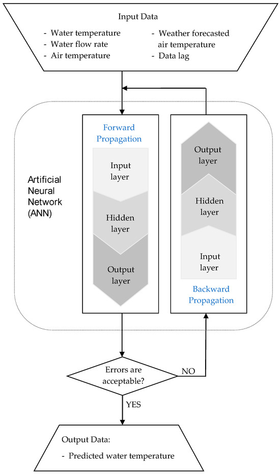 In addition to air temperature, which is the dominant physical quantity that has the greatest influence on river water temperature, discharge is the second critical factor exerting significant impact on water temperature [5]. These two input variables together with the water temperature are suitable and adequate for a sound ANN prediction [42]. As well, as previously mentioned, the ANN can handle the noisiness of the meteorological data [19,20,21].