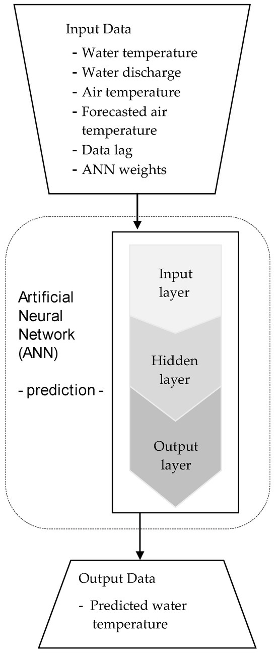 In the output layer is the neuron corresponding to the predicted water temperature, having the same lag time as the weather forecasted air temperature.