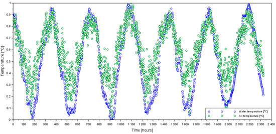 where is the normalized value, and and are the minimum and maximum values of , respectively, from the entire study period. The interval ranges for the considered variables were obtained from the available data: (0.1–28.4) °C for the Danube water temperature; (−16.22 to 31.82) °C for air temperature; and (2120–14,600) m3/s for the discharge.