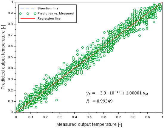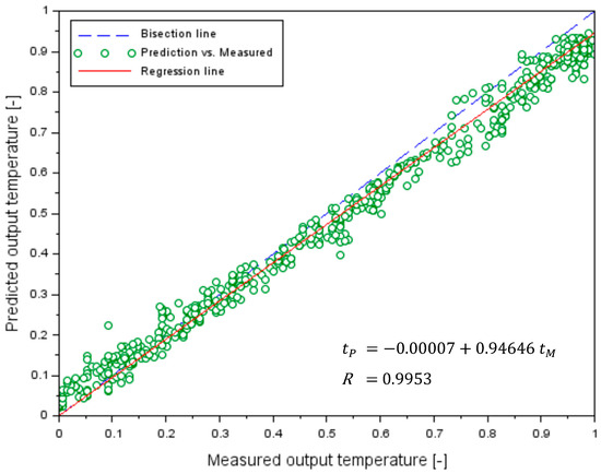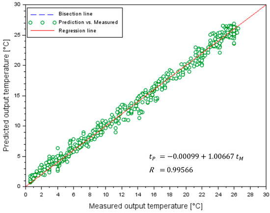 Similar results were obtained by evaluating the model’s prediction capability when inputting new data. The equations in Figure 15 and Figure 16 (normalized temperature values and temperature values, respectively) show an even better correlation between the measured and predicted temperatures 7 days later. The data fit close to the bisection line, with a Pearson correlation coefficient of R = 0.995.