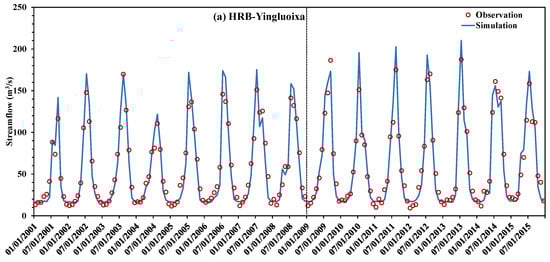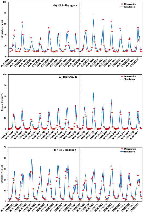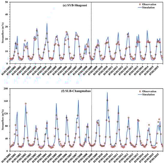 Comparison of observed and simulated monthly streamflow at six hydrological stations: (a) Yingluoxia in HRB; (b) Jiayuguan in HRB; (c) Xindi in HRB; (d) Jiutiaoling in SYB; (e) Shagousi in SYB; and (f) Changmabao in SLB. The mid line in the figure indicates the calibration and validation period.