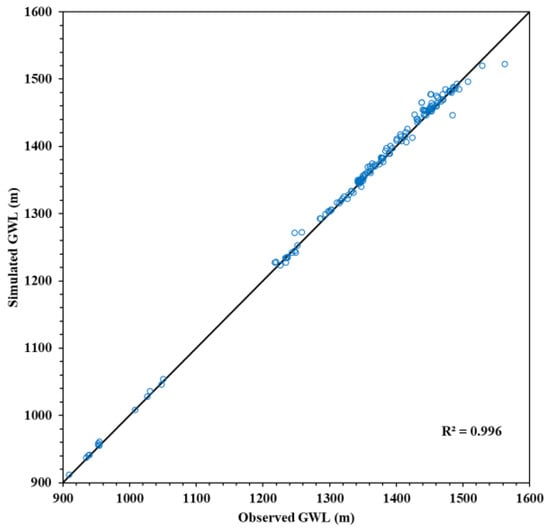 Figure 4 presents a comparison between the simulated and observed average groundwater level from 2001 to 2010 at the 94 observation wells during the calibration period. The figure indicates a reasonable match between observed and simulated GWLs. The R2 is 0.99 and the RMSE is 10.5 m. Considering that the difference between the highest and lowest GWL across the model domain is over 1500 m, the discrepancy is reasonable.
