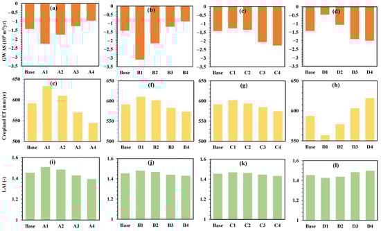 Response of major Water–Ecosystem–Agriculture Nexus variables: (a–d) groundwater storage change (GW ΔS) in the midstream; (e–h) cropland evapotranspiration (ET) in the midstream; and (i–l) leaf-area index (LAI) in the downstream for the four types of scenarios.