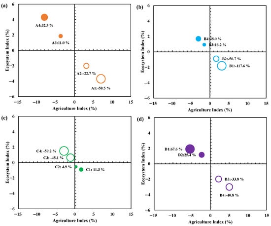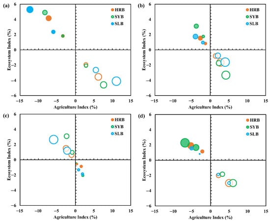 A comparison of the Water–Ecosystem–Agriculture nexus between HRB, SYB, and SLB under the four types of scenarios: (a) Scenario Type A; (b) Scenario Type B; (c) Scenario Type C; and (d) Scenario Type D. The sizes of the bubbles reflect the absolute value of the CI of groundwater storage change in the midstream (water index). Hollow bubbles indicate positive CI values, and solid bubbles indicate negative values.