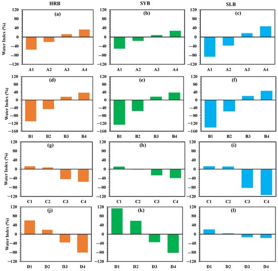 The water index for the three basins: HRB, SYB, and SLB. A1 to A4 represent scenarios A1 to A4, and similarly, B1 to B4, C1 to C4, and D1 to D4 follow the same pattern (a–l). The scenario descriptions are provided in Table 2.