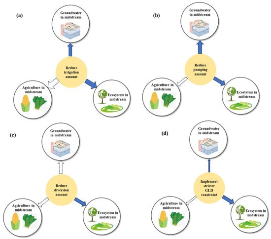 A more intuitive summary of the WEA nexus characteristics revealed by the “disturbance-evolution” simulation in the study area is presented in Figure 11. Figure 11a shows that increasing total irrigation amounts improves the agricultural sector but accelerate groundwater depletion in the midstream and causes ecological deterioration in the downstream. In contrast, decreasing the total irrigation amounts results in the improvement of both midstream groundwater and the downstream ecosystem. Figure 9b shows that merely reducing groundwater pumping has a negative impact on the agriculture sector but has a positive impact on the downstream ecosystem, and has a slight impact on midstream groundwater storage. Figure 11b shows that merely reducing surface-water diversion has a negative impact on the agriculture sector but has a positive impact on the downstream ecosystem, and has significant impact on midstream groundwater storage. Figure 11c shows that merely reducing surface-water diversion has negative impact both on agriculture sector and midstream groundwater storage, but has a positive impact on the downstream ecosystem. Figure 11d shows that implementing stricter GLD constraints has positive impact both on midstream groundwater storage and the downstream ecosystem, but has negative impact on agriculture sector.