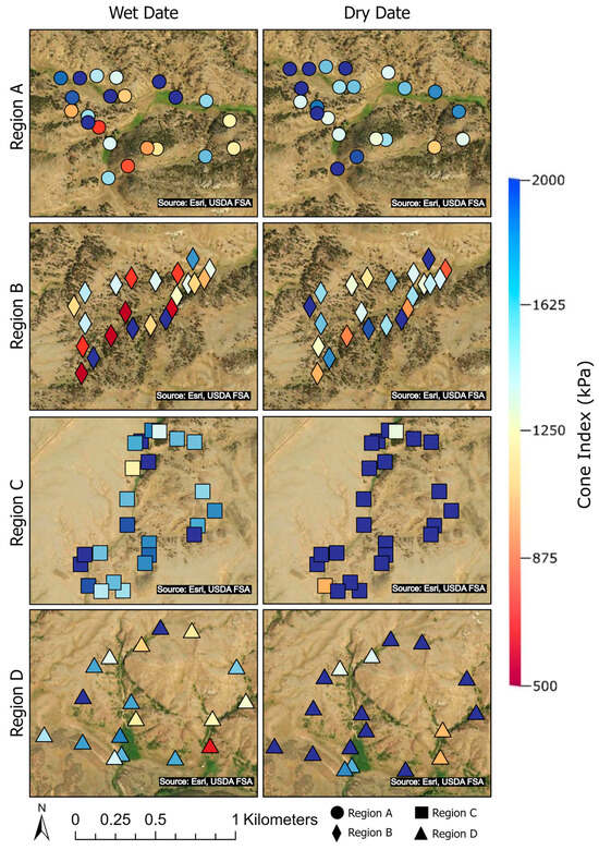 3.4. Relationships Between Soil Moisture/Strength and Regional Attributes