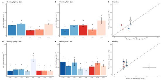 Mean (± SE) leaf water storage in mL cm−2 during the calm water displacement experiment in the (A) overstory during spring, (B) overstory during fall, (C) overstory comparison between spring and fall, (D) midstory during spring, (E) midstory during fall, and (F) midstory comparison between spring and fall. In panels (C,F), deviations from the 1:1 dotted line indicate seasonal differences in leaf water storage. Significant differences (p < 0.05) between species are denoted with different lowercase letters.