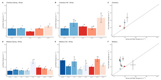 Mean (± SE) leaf water storage in mL cm−2 during the windy water displacement experiment in the (A) overstory during spring, (B) overstory during fall, (C) overstory comparison between spring and fall, (D) midstory during spring, (E) midstory during fall, and (F) midstory comparison between spring and fall. In panels (C,F), deviations from the 1:1 dotted line indicate seasonal differences in leaf water storage. Significant differences (p < 0.05) between species are denoted with different lowercase letters.