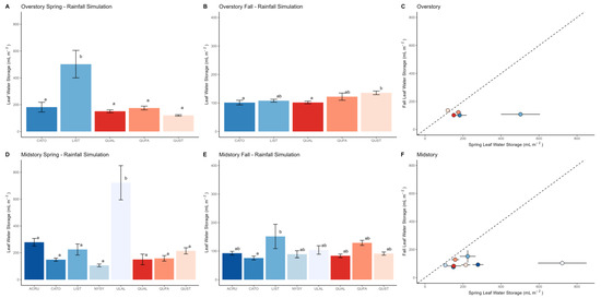 Mean (± SE) leaf water storage in mL cm−2 during the rainfall simulation experiment in the (A) overstory during spring, (B) overstory during fall, (C) overstory comparison between spring and fall, (D) midstory during spring, (E) midstory during fall, and (F) midstory comparison between spring and fall. In panels (C,F), deviations from the 1:1 dotted line indicate seasonal differences in leaf water storage. Significant differences (p < 0.05) between species are denoted with different lowercase letters.