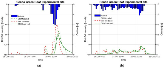 The hyetographs and the corresponding observed green roof outflows compared with the simulated ones extracted from the continuous simulation of the green roof and the reference impervious roofs for two selected rainfall events observed at the Genoa (a) and Rende (b) experimental sites.