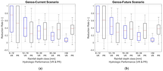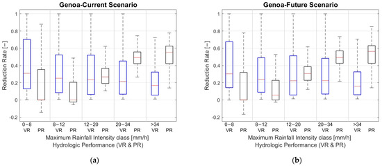 Concerning the impact of maximum rainfall intensity, the hydrologic performance behaviour observed for the Genoa experimental site is reported in Figure 4. VR median values slightly decrease across all classes while PR median values show a significant increase from almost zero to 0.57 for rainfall intensity classes equal to or larger than 12 mm/h; furthermore, a corresponding decrease in the IQR with maximum rainfall intensity is detected. The same behaviour, as well as similar VR and PR values, are observed for the future scenario. It has to be noticed that the PR negative values are observed solely for the smallest values where the corresponding peak flow rate may be not properly modelled.