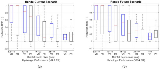 Non-parametric distribution of the volume and peak reduction rates of the Rende experimental site for each rainfall depth class with respect to the current (a) and future (b) scenarios. Note that the volume reduction is reported as blue boxes while the peak reduction is reported as dark grey boxes.