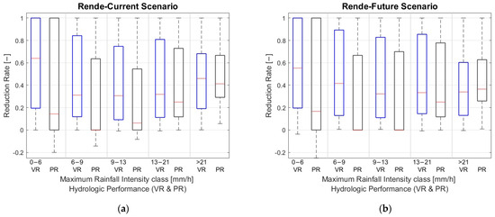 Non-parametric distribution of the hydrologic performance of the Rende experimental site for each maximum rainfall intensity class with respect to the current (a) and future (b) scenarios. Note that the volume reduction is reported as blue boxes while the peak reduction is reported as dark grey boxes.