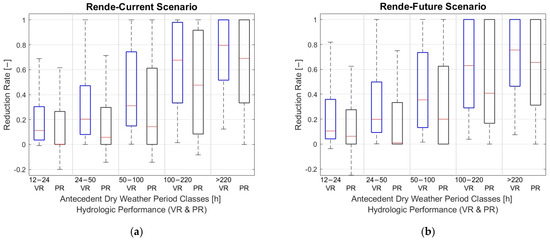 Non-parametric distribution of the hydrologic performance of the Rende experimental site for each Antecedent Dry Weather Period class with respect to the current (a) and future (b) scenarios. Note that the volume reduction is reported as blue boxes while the peak reduction is reported as dark grey boxes.