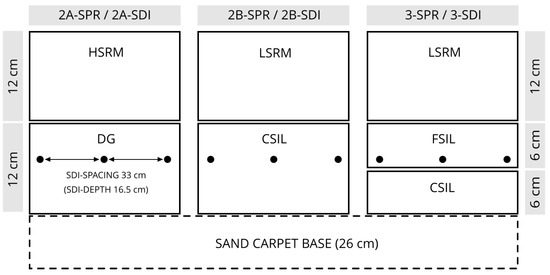 In accordance with the German Standards for Sports Grounds [71], two of the construction methods had a two-layered design (2A and 2B). Rootzone 2A was 12 cm HSRM over 12 cm DG and rootzone construction method 2B comprised 12 cm LSRM over 12 cm CSIL. Based on the guidelines of the United States Golf Association [77], the third construction method featured a three-layer design consisting of 12 cm of LSRM placed over 6 cm of FSIL which was subtended by 6 cm of CSIL. Each construction method was supported by an underlying 26 cm sand carpet base with a grain size of up to 2 mm for drainage (Figure 1).