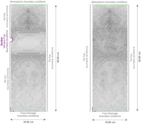 Triangular grid used for HYDRUS-2D simulations for SDI (left) and SPR (right) variants and related boundary conditions.