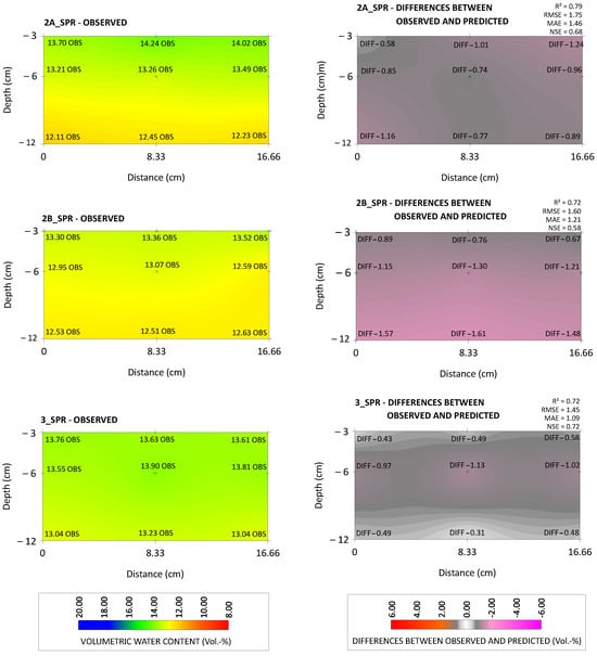 Graphical analysis showed that, for the SPR variants 2A and 2B, the model tended to calculate predicted values that were higher than the observed values. At an observation depth of 6 cm, the average overestimation was 0.85 vol.% for 2A and 1.22 vol.% for 2B. At a depth of 12 cm, the average overestimation was 0.94 vol.% for 2A and 1.55 vol.% for 2B. In the case of the SDI system, average overestimations within variant 2A of 1.27 vol.% (6 cm depth) and 3.11 vol.% (12 cm depth) were observed. In contrast, variant 3_SDI exhibited a different pattern, with the model generating predicted values that were lower than the observed ones. The average underestimation was 1.54 vol.% at a depth of 6 cm and 2.27 vol.% at a depth of 12 cm. Similar to the model’s performance, variant 3 showed the most minor differences among the SPR variants, while 2B displayed the least variation among the SDI variants.