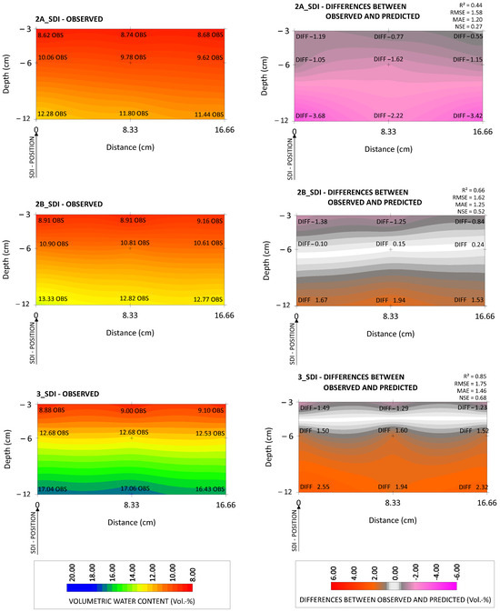 Volumetric water content within SDI variants 2A_SDI, 2B_SDI, and 3_SDI at observation depths of 3, 6, and 11 cm (averaged values across entire observation time 0–48 h) shown as observed values (left) and differences between the observed and predicted values (right).