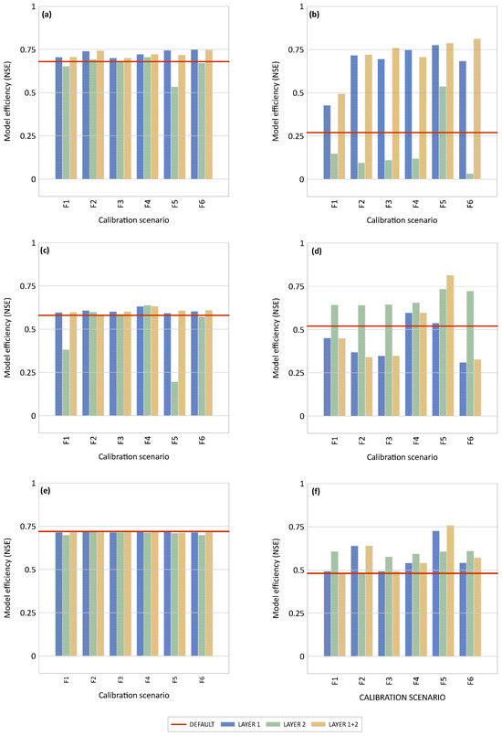 Development of model efficiency (NSE) under various calibration scenarios (F1–F6) used in isolated implementation (Layer 1 and Layer 2) and combined implementation (Layer 1 + 2) across variants (a) 2A_SPR, (b) 2A_SDI, (c) 2B_SPR, (d) 2B_SDI, (e) 3_SPR, and (f) 3_SDI. The red line indicates the model efficiency values under the default settings.