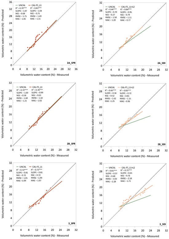 Measured and predicted volumetric water contents for construction methods 2A, 2B, and 3 across uncalibrated (UNCAL) and calibrated (CAL) models. SPR variants under scenario F5_L1 (left) are represented by red line and dots, while SDI variants (right) under scenario F5_L1 + L2 are shown in orange dots. R2 refers to the correlation coefficient; significance levels: *** p < 0.001.
