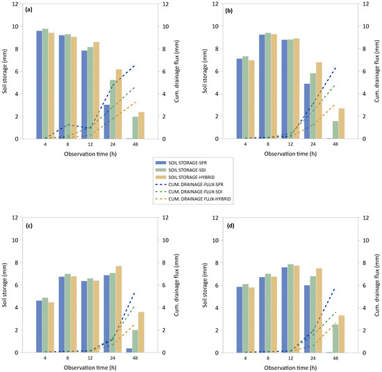 Development of soil water storage (upper 50 cm) and cumulative drainage flux of the three-layered construction method 3, irrigation approaches (a–d): (a) one irrigation event within 12 h, (b) two irrigation events within 12 h, (c) three irrigation events within 12 h, (d) four irrigation events within 12 h under 10 mm SPR, SDI, and hybrid irrigation; observation time: 4, 8, 12, 24, and 48 h after irrigation initiation.