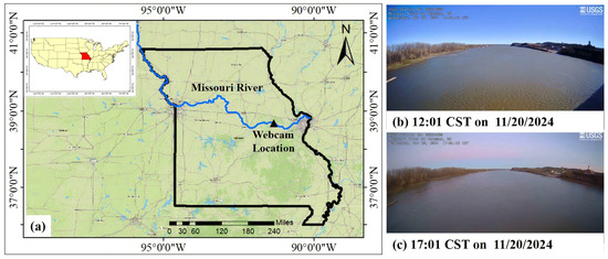 (a) Location of the webcam at the Missouri River at Hermann, Missouri. (b,c) Two sample images at two different times ((b): 12:01 CST; (c): 17:01 CST) on 11/20/2024, available on the HIVIS portal.