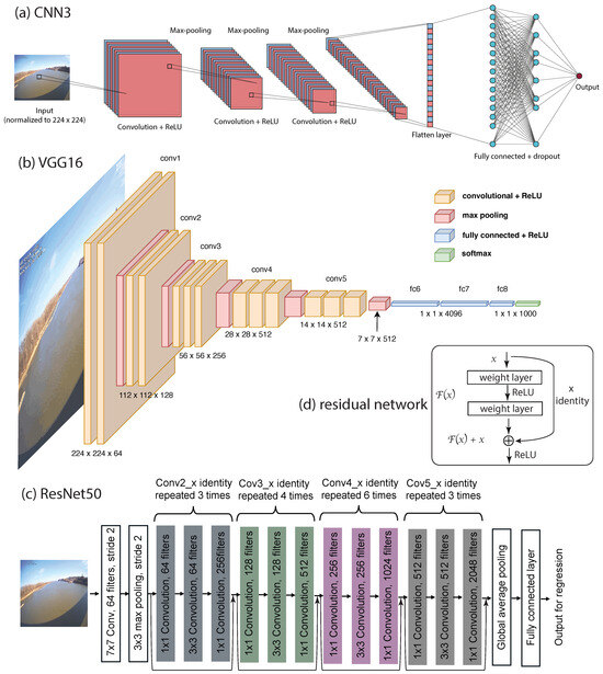 Architecture of the (a) CNN3 model; (b) VGG16 model; and (c) ResNet50 model. The residual network in the ResNet50 model is shown in subplot (d).