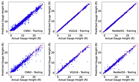 For gauge height estimation, a simple three-layer CNN model achieved strong performance, with an R2 of 0.981 during training and 0.959 during testing (Table 1, Figure 3). Deeper neural architectures in VGG16 and ResNet50 significantly enhance the capture of nonlinear relationships between image intensity values and gauge height, leading to further improvements in R2 for both training and testing (Table 1, Figure 3). While R2 indicates overall model fit, root-mean-square-error (RMSE) provides a more interpretable measure of performance. The CNN3 model yielded RMSE values of 0.58 ft for training and 0.86 ft for testing. Compared to the mean gauge height of 6.63 ft during the model training period, the RMSE values correspond to errors of 8.7% for training and 13.0% for testing. Among the DL models, VGG16 achieved an RMSE of 0.18 ft in training and 0.50 ft in testing. ResNet50 produced slightly higher RMSE values but benefited from a faster training period. Both VGG16 and ResNet50 demonstrated comparable testing errors to CNN3’s training error.