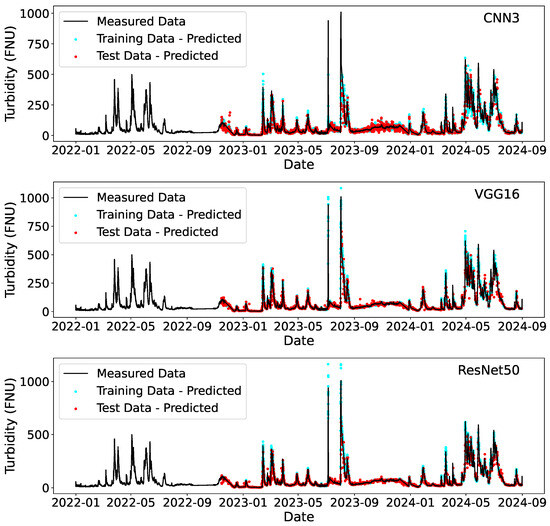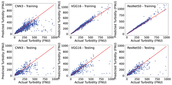 Compared to gauge height estimation, turbidity estimation is significantly more challenging. While model training maintained high R2 values, particularly in VGG16 and ResNet50, these values dropped substantially during testing (Table 1, Figure 4). This decline is expected, as turbidity is influenced by water color and opacity, which are also affected by sunlight, weather conditions, and webcam exposure [10]. These external factors interact with turbidity’s effect on water appearance, making it difficult to establish a clear quantitative relationship between images and turbidity, even when such a relationship exists. The results indicate that the RMSE for turbidity estimation using images ranges from 40 to 50 FTU (Table 1), which is lower than the mean turbidity value of 74.94 FTU. Therefore, turbidity estimation using DL models proved unsatisfactory.