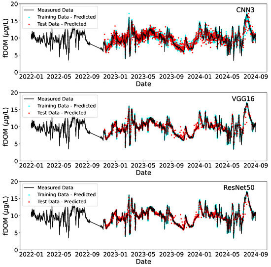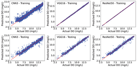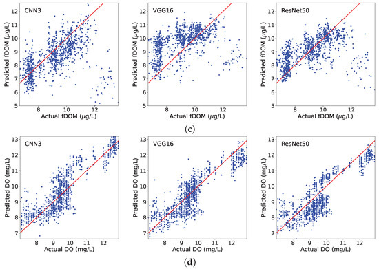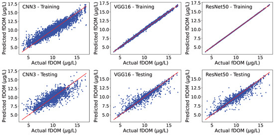 DO and fDMO estimation show similar performance. During training, VGG16 and ResNet50 achieved near-perfect R2 values caused by over-fitting. This is evidenced by the nearly perfect 1:1 line in the training phase, contrasted with a more scattered prediction vs. actual plot during testing (Figure 5 and Figure 6). For both parameters, VGG16 and ResNet50 achieved testing RMSE values that were either smaller than or comparable to the training RMSE for CNN3. The results demonstrate improved model performance in the test phase, benefited from deeper neural layers.