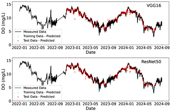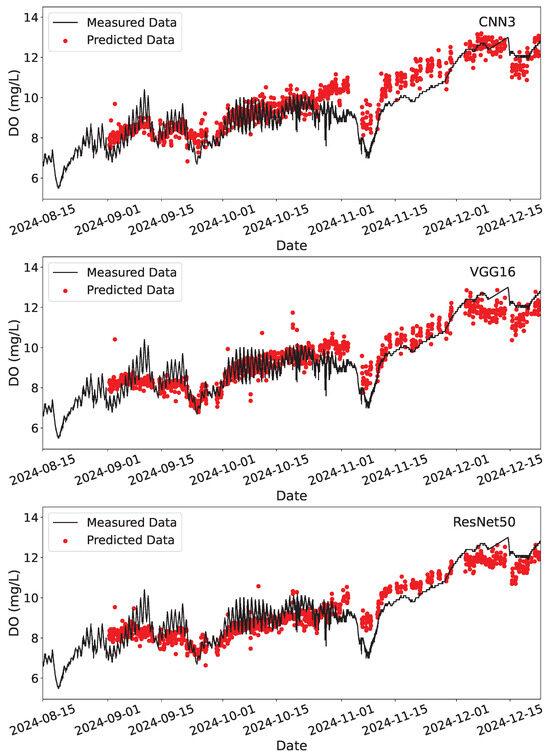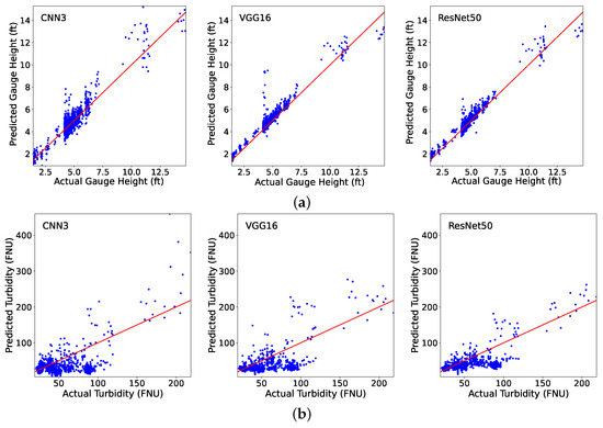 We note that different ML models may be suitable for different tasks in hydraulic and hydrological applications [46,47]. For instance, CNN3 might be suitable for simpler relationship, while deeper architectures in VGG16 and ResNet50 are better suited for more complex relationships. VGG16 has a uniform architecture, which can effectively learn the global patterns across images related to the characteristics of water quality. ResNet50 uses a skip-connection algorithm that can learn the long-range dependencies in images while mitigating the vanishing gradient problem. The ability of ML models to predict gauge height is quite intuitive, due to the direct relationship between images and water level changes. The effectiveness of ML models in predicting water quality parameters (e.g., DO) indicates that these models can also detect complex patterns or deeply encoded relationships within the images.