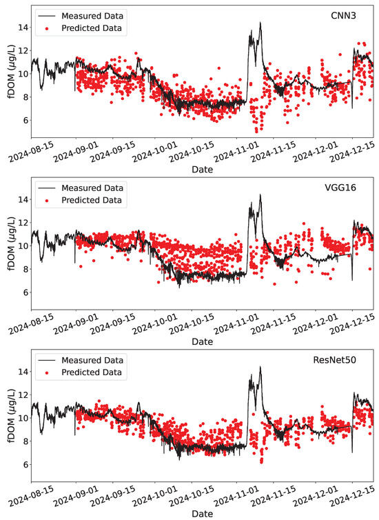 During the deployment period for ‘future’ events, the results indicate that the simple three-layer model (CNN3) is effective in identifying patterns and trends in hydrological parameters but performs poorly in prediction. DL models, including VGG16 and ResNet50, exhibit similar predictive abilities across all four parameters. Both models achieve satisfactory predictions for gauge height and offer some insights into turbidity and fDOM, though their predictions for these parameters remain inadequate. Surprisingly, both models demonstrate reasonably accurate predictions for DO concentration in water.