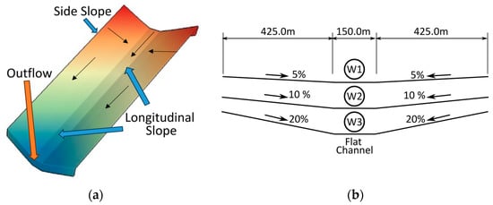 The simulations consisted of three watersheds, each covering an area of 1 km by 2 km. The cross-sectional shape of each watershed is trapezoidal, with varying longitudinal and cross-sectional slopes, as shown in Figure 1. The longitudinal and cross-sectional slopes are equal in each watershed. The central section of each watershed, spanning a width of 150 m at the base, has only a longitudinal slope, while the side slopes extend 425 m on each side.