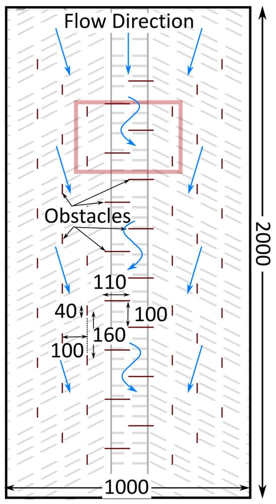 Distribution of the obstructions on the experimental watershed (lengths in meters). The red zone indicates the area for displaying the results of the Froude and Reynolds numbers. Blue arrows represent potential flow paths.