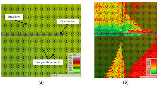 Mesh for FVM model on flow area, (a) around break lines and obstructions and, (b) typical raw results showing pixel resolution compared to mesh dimensions (about 4 × 4 pixels/element).